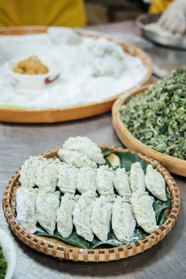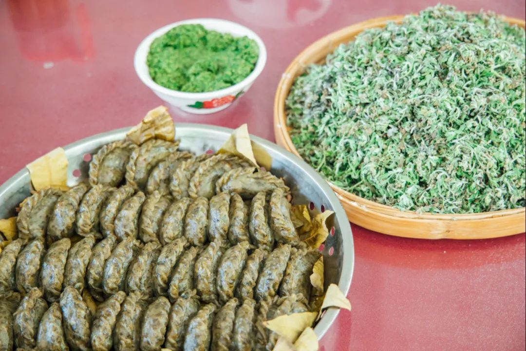 刚刚从自家院子里采集的龙眼叶铺在盆底,一方面防止艾角蒸煮之后沾到盆底,另一方面,它独特的风格和味道,让艾角吃起来更香气四溢。