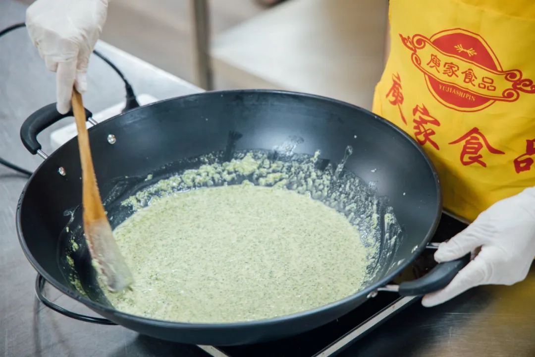 将二月艾剁碎,加入糖水后。需倒进铁锅中用力翻炒,要等艾草粘稠至结团方可。没有别的窍门,就是坚持翻炒的力气。