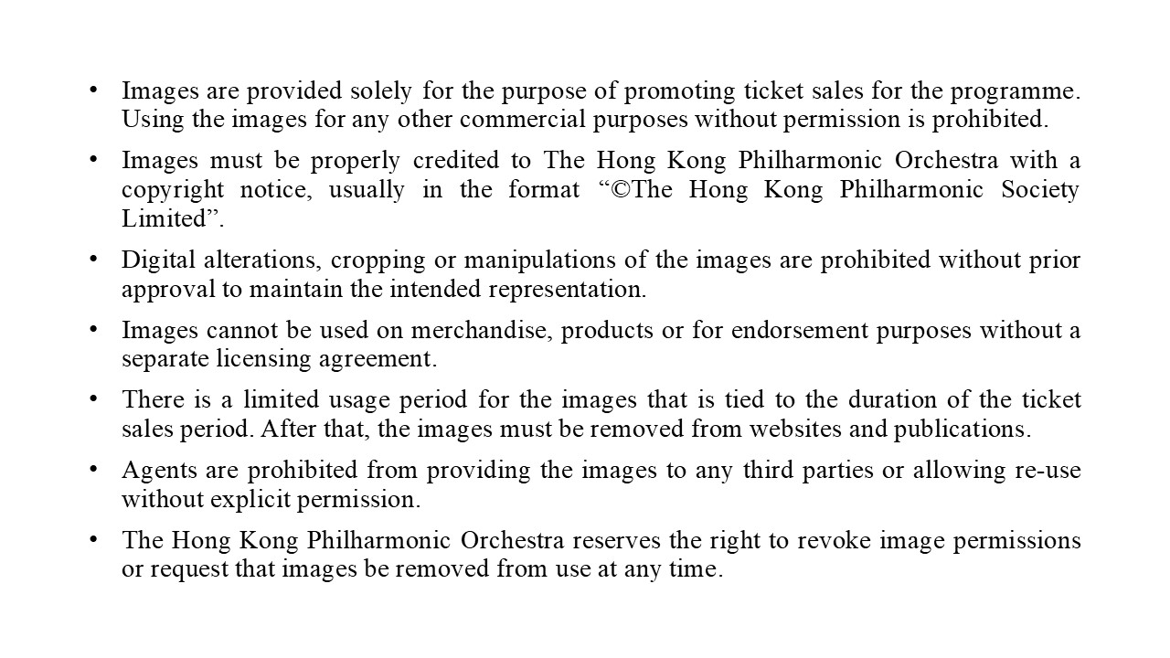 If you need to use the programme content and images, you may download them by clicking on the images below and please follow the photo usage instructions of the The Hong Kong Philharmonic Orchestra. Click Here to read the guidelines.