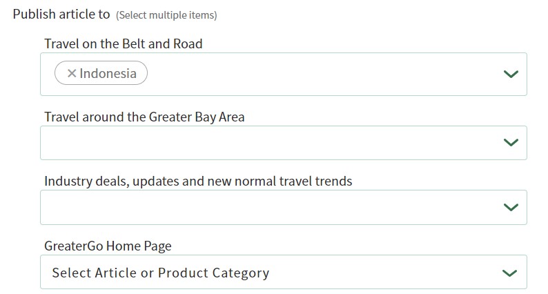To deliver your article/product most accurately to your target audience, it is important to choose the right section to publish your article. For example, if the article or product is about Indonesia, you may choose the section "Travel on the Belt and Road" and select "Indonesia". The article/product will be displayed in the right section. |