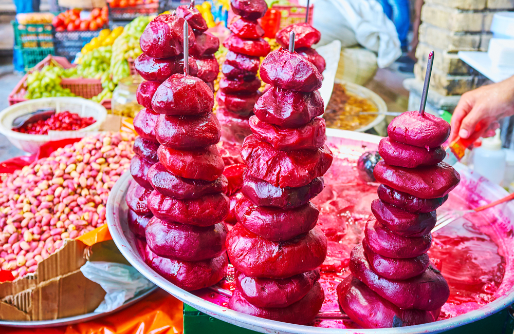 在大巴扎熟食摊档能买到的红菜头串串,外形有点像冰糖葫芦。