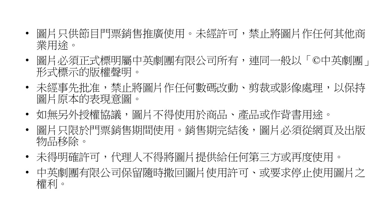 如需要使用節目內容及圖片,可按下方圖片下載,並請遵照中英劇團指示。按此閱讀指示。
